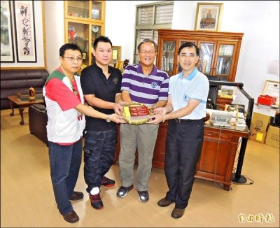 苗栗市知名美食老店「江技舊記餛飩」專賣店回饋社會,致贈餛飩餐券給弱勢兒童,由第三代江致德(左二)代表致贈,市長邱炳坤(右二)等人代表接受。(記者張勳騰攝)