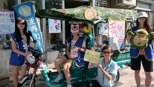 一群長期支持世界和平會的善心人士,集資購買兩輛電動三輪車、一輛電動機車,將做為運送物資、捐助品與義賣品等用途,讓和平會可以更有效率服務受飢兒。義工們也發揮巧思布置三輪車,貼上「搶救受飢兒」的字樣及海報,民眾只要捐出十元硬幣,就可以與三輪車合影留念。
