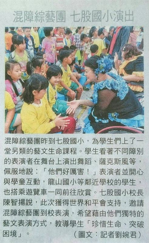混障綜藝團昨到七股國小,為學生們上了一堂另類的藝文生命課程。學生看著不同障別的表演者在舞台上演出舞蹈、薩克斯風等,佩服地說:「他們好厲害!」表演者並開心與學童互動,龍山國小等鄰近學校的學生,也搭乘遊覽車一同前往欣賞。七股國小校長陳智揚說,此次獲得世界和平會支持,邀請混障綜藝團到校表演,希望藉由他們獨特的藝文表演,教導學生「珍惜生命、突破困境」。(圖文:記者劉婉君)