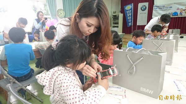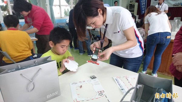 學童們在中鎂汽車公司的大哥哥、大姊姊帶領下,進行手做遊戲,因學童得先「做」一輛BMW的紙模型車,有學童說:「我只坐過馬自達,沒有坐過BMW」,童言童語,讓人莞爾。(記者彭健禮攝)