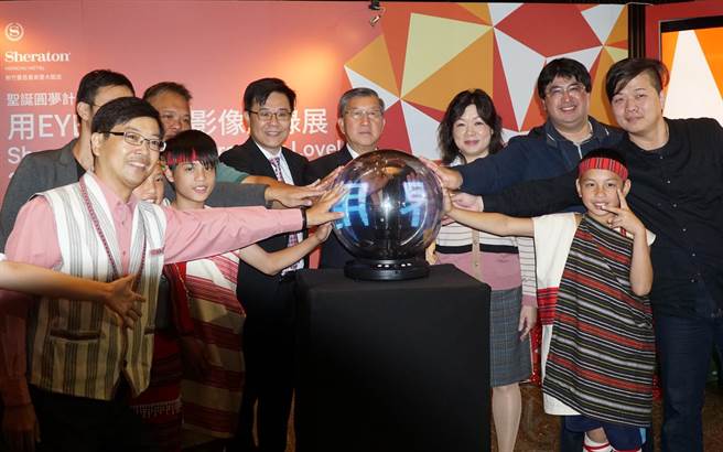 新竹豐邑喜來登大飯店22日起於大廳展出「用Eye看世界─活動記錄展覽」,縣長邱鏡淳(右四)今天也與偏鄉孩子們共同分享這分喜悅。(陳育賢攝)