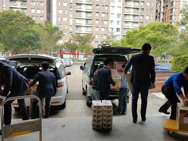 圖由佳泰建設「佳泰世紀城」提供/「佳泰世紀城」銷售團隊人員當天一早便前往竹北婦幼館將準備好的民生用品與物資運上車。