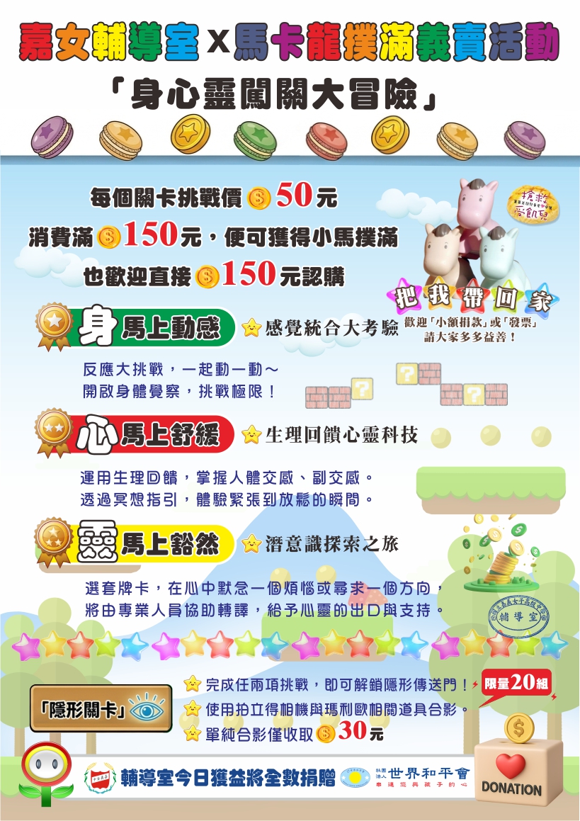 更令人感動的是,這份探索自我的能量,隨即轉化為對他人的關懷。現場結合世界和平會的馬卡龍生肖撲滿義賣,同學們熱情響應,將一份份的愛心匯聚在一起。義賣所得全數捐助「搶救受飢兒」服務計畫,幫助服務兒少擁有穩定的餐食,在愛中健康長大。