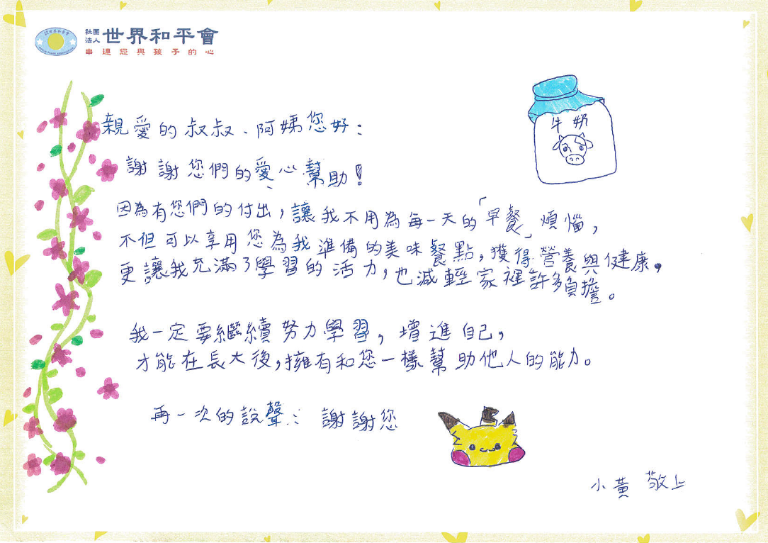 小妍參加和平會在學校資助的太鼓社社團活動,也珍惜參與讀寫課程。剛開始小妍覺得太鼓好難喔,還要記口訣跟打擊動作,但隨著時間累計無數次的練習,小妍就打出興趣來了,他說能抒發不愉快的狀態、可以讓心情變好、還體會到什麼是團結,也有勇氣上台演出,覺得自己還挺棒的!世界和平會提供多面向的服務,讓小妍有扶助金與愛心早餐,能安心的學習知識;也有機會做讀寫與太鼓的練習參與,學習抒發情緒與整理心情,不受家中經濟辛苦的困難而束縛。