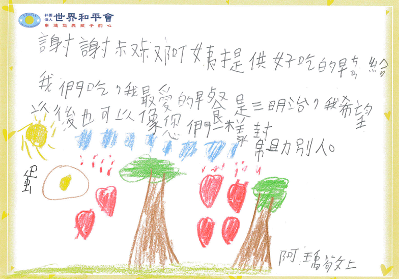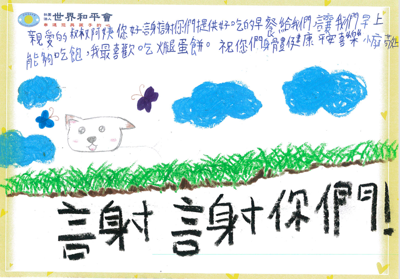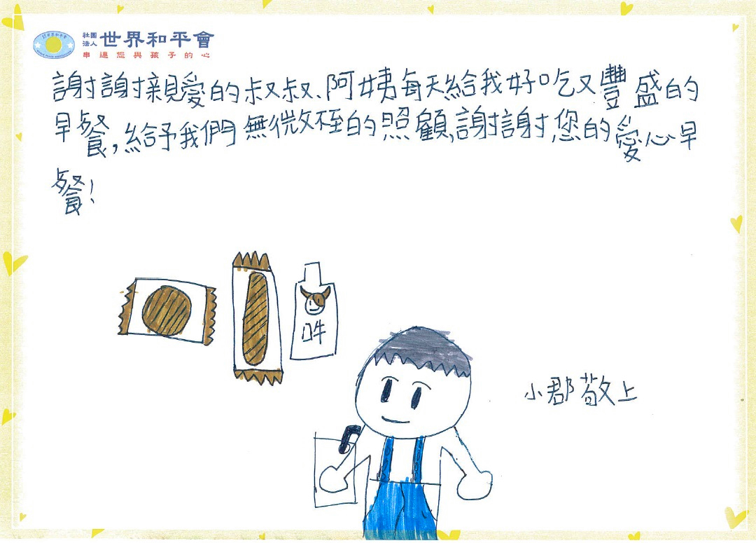 你我身邊就有許多受飢兒,因家中經濟困難、疏忽、無力照顧,中午依靠學校或政府補助的餐點,晚餐打包午餐的剩菜飯,但是早上總是餓著肚子上學。世界和平會從愛心早餐出發,本著「照顧好一個孩子,讓社會多一個有希望的人生」的宗旨,關心孩子能夠吃得飽,基本的需求得到滿足,進而好好的學習,使自己的未來有不一樣的可能。( 了解更多關於「搶救受飢兒」服務計畫 )