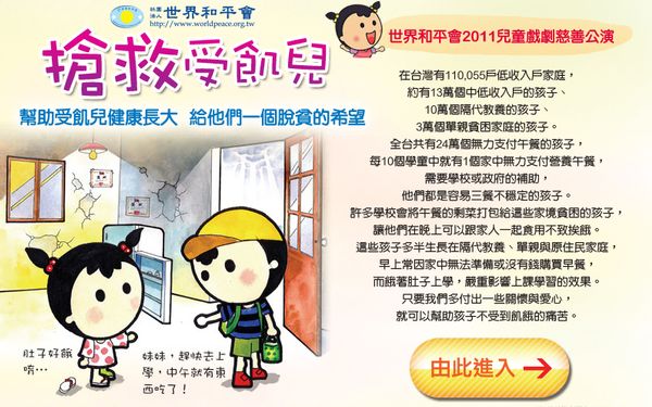 「搶救受飢兒」貧弱家庭兒童愛心早餐與營養食品服務 認識受飢兒 在台灣有110,055戶低收入戶家庭,約有13萬個中低收入戶的孩子、10萬個隔代教養的孩子、3萬個單親家庭的孩子。 全台共有24萬個無力支付午餐的孩子,每10個學童中就有1個家中無力支付營養午餐,需要學校或政府的補助,他們都是容易三餐不穩定的孩子。 許多學校會將午餐的剩菜打包給這些家境貧困的孩子,讓他們在晚上可以跟家人一起食用不致挨餓。這些孩子多半生長在隔代教養、單親與原住民家庭,早上常因家中無法準備或沒有錢購買早餐,而餓著肚子上學,嚴重影響上課學習的效果。 這些家境貧弱的孩子食用捐助者的愛心早餐與獲得各界的鼓勵後,增強了他們努力學習與脫離貧窮的動力。 1.國小二年級的小維說:謝謝叔叔阿姨的關心,讓我覺得不是只有阿嬤照顧我,有很多人都希望我好好長大。 2.國小四年級的雅雅說:看了大家給我的祝福讓我覺得瞬間充滿了力量,我會好好努力念書的。 3.國小五年級的小蓁說:謝謝!我覺得更有信心讀書,不確定或不敢做的事也更有勇氣去做!我們的服務成果 從97年下半年起,本會全國共提供89間國小(包括宜蘭縣、基隆市、台北市、新北市、桃園縣、新竹縣、新竹市、苗栗縣、台中市、雲林縣、嘉義縣、台南市、高雄縣、屏東縣、台東縣),共照顧2,070位孩子的愛心早餐,提供340,354份餐點,幫助受飢兒童可以在上課前吃到營養豐盛的早餐,不需再挨餓等待補助的中餐。 同時為了讓孩子在晚間與假日也不致於挨餓,本會照顧了135間國小,共3,741位孩子營養食品,提供12,211份食品(每份包含:奶粉、肉鬆、麥片、高纖蘇打、白米…等),讓孩子在晚間或假日可以自行料理食用。愛心早餐讓受飢兒「二代脫貧」的願望成真 早餐不僅對於成人來說是一天最重要的一餐,對於發育中的孩子來說,大部分課程都集中在早上(國小一、二年級甚至下午不上課),因此,能不能學習得好,早餐的食用非常重要! 本會長期服務國小貧童,發現: 1.總是沒吃早餐(或吃不飽)的孩子,在課業學習上相對缺乏精力,因為沒有足夠的體力與精神面對課堂學習;提供愛心早餐與營養食品能使孩子們不再餓著肚子上課,可以更專注學習。 2.因為沒東西吃被同學取笑,或是身材瘦弱被同學欺負的孩子,提供愛心早餐與營養食品可以補充孩子營養,也減少其自卑感,增加對自己的信心。 3.在身體與心理都獲得能量後,孩子上課更專注,課業成績提升,將可從教育達到二代脫貧的夢想,改善自己與家人的生活環境。 當我們關心國外的飢餓兒童時,可否注意到,在你我身邊就有許多受飢兒,急需你的援助,每一個受飢兒都有一個令人感傷故事,他們無法決定自己的出身,但應該被關懷,過著無憂無慮的生活。 我們急需您的善心協助,幫助貧童的愛心早餐與營養食品。每餐40元的早餐, 1. 1,000元可以幫助一位兒童一個月的早餐。 2. 4,000元可以幫助一位兒童一學期的早餐。 3. 12,000元可以幫助一位兒童全年度的早餐與營養食品。《捐助方式》1.現金捐贈:請直接到本會各縣市會館捐贈(查詢各縣市地址) 2.郵局劃撥:戶名:社團法人世界和平會 帳號:19964921 註明『搶救受飢兒』3.銀行匯款:戶名:世界和平會 帳號:5050-01-00471-200 (彰化銀行建成分行‧代碼009)4.信用卡:請至Yahoo!奇摩公益線上捐款,或向本會索取信用卡捐款授權書(02-2552-8828)。5.便利商店:請向本會索取便利商店條碼繳款單(02-2552-8828),可向全省便利商店繳款。◎欲指定服務縣市者,請於備註欄註明,謝謝!