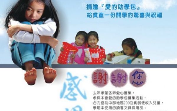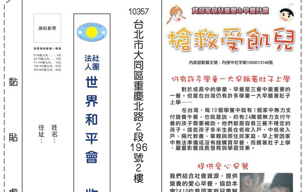 「搶救危機兒-愛的助學包」大募集 「搶救危機兒-愛的助學包」大募集籌募中部地區貧弱家庭兒童1000份「愛的助學包」一、緣起又將新學期的到來,但是,仍然有許多身處在貧弱危機家庭的兒童,家庭經濟困難,他們只求生活,而新的讀書生活用品對他們來說無疑是一種奢求。因此,世界和平會邀請擔任助學天使,捐贈600元為貧弱危機家庭兒童準備一份「愛的助學包」,讓他(她)們安心讀書,快樂成長,創造無限希望與契機。並邀請社會大眾一起投入關懷貧童的行列,共同發揮善心、支持公益,形成社會互助良性動能,將愛心善念的光散發到各角落,讓社會更健康祥和。二、目標:(一)籌募世界和平會中部地區1000位貧弱危機家庭兒童之助學禮物。(二)籌募世界和平會中部地區300位貧弱危機家庭兒童教育助學與兒童課後照顧經費。三、辦理單位(一)主辦單位:社團法人世界和平會(二)協辦單位:社團法人世界慈善會.各愛心公司企業或單位(三)協助單位:味丹文教基金會四、捐贈對象中部地區低收入戶、單親、隔代、新住民家庭中之貧弱危機家庭兒童,共1000位。五、愛心參與方式:(一)捐贈現金1.捐贈600元,讓貧弱危機家庭兒童於開學時,可以收到一份愛的禮物-『愛的助學包』,幫助他們於求學更加順利,減輕家庭經濟負擔。2.邀請企業單位或個人擔任愛心助養人,長期贊助貧弱危機家庭兒童助學金,每名兒童每月1,000元。3.不定期捐贈,作為愛的助學包或教育助學經費贊助。(二)捐贈愛心物資:作為貧弱危機家庭兒童開學的禮物,如讀書生活用品。(三)捐贈方式1.郵局劃撥: 戶名:世界和平會 劃撥帳號:19964921 註明『愛的助學包』2.自動轉帳:請向本會索取銀行郵局自動扣款授權書 3.信用卡:請向本會索取信用卡捐款授權書4.便利商店:請向本會索取便利商店條碼繳款單,可向全省便利商店繳款。5.網路捐款:至本會網站捐贈愛心(便利店條碼/信用卡) http://www.worldpeace.org.tw/lovebag6.現金捐款:請直接到本會中部地區各會館捐贈。 地點 電話 傳真 地址台中市會館 04-2316-1106 04-2316-1533 台中市西屯區寧夏路111號台中縣會館 04-2525-4668 04-2515-8943 台中縣豐原市豐勢路1段52巷1號彰化縣會館 04-727-9248 04-728-0459 彰化市民族路129巷22號