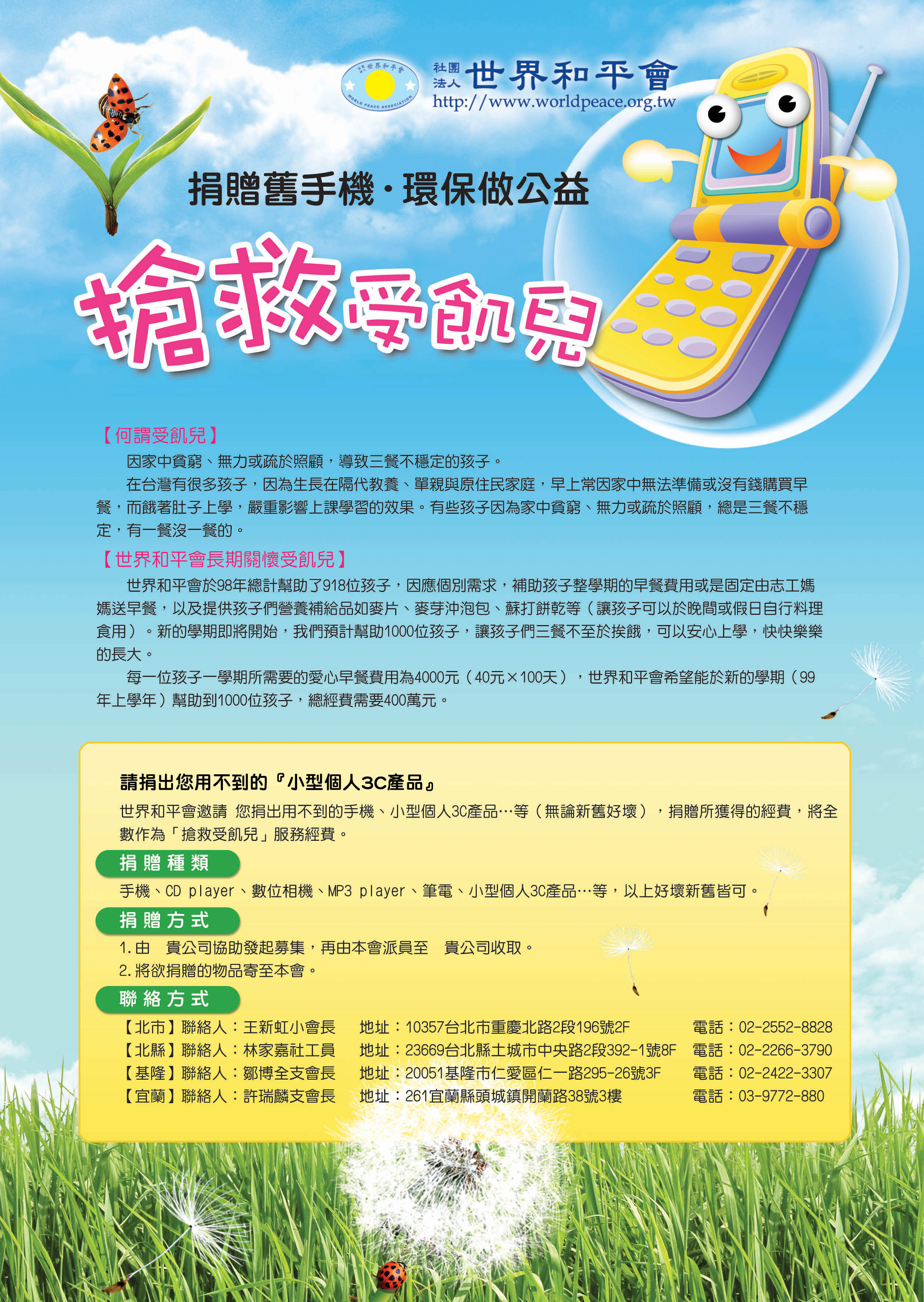 世界和平會於98年總計幫助了918位孩子,因應個別需求,補助孩子整學期的早餐費用或是固定由志工媽媽送早餐,以及提供孩子們營養補給品如麥片、麥芽沖泡包、蘇打餅乾等(讓孩子可以於晚間或假日自行料理食用)。新的學期即將開始,我們預計幫助1000位孩子,讓孩子們早餐不至於挨餓,可以安心上學,快快樂樂的長大。每一位孩子一學期所需要的愛心早餐費用為4000元(40元×100天),世界和平會希望能於新的學期(99年上學年)幫助到1000位孩子,總經費需要400萬元。協助方式:世界和平會邀請您捐贈用不到的手機、小型個人3C產品…等(無論新舊好壞),捐贈所獲得的經費,將全數作為「搶救受飢兒」服務經費。