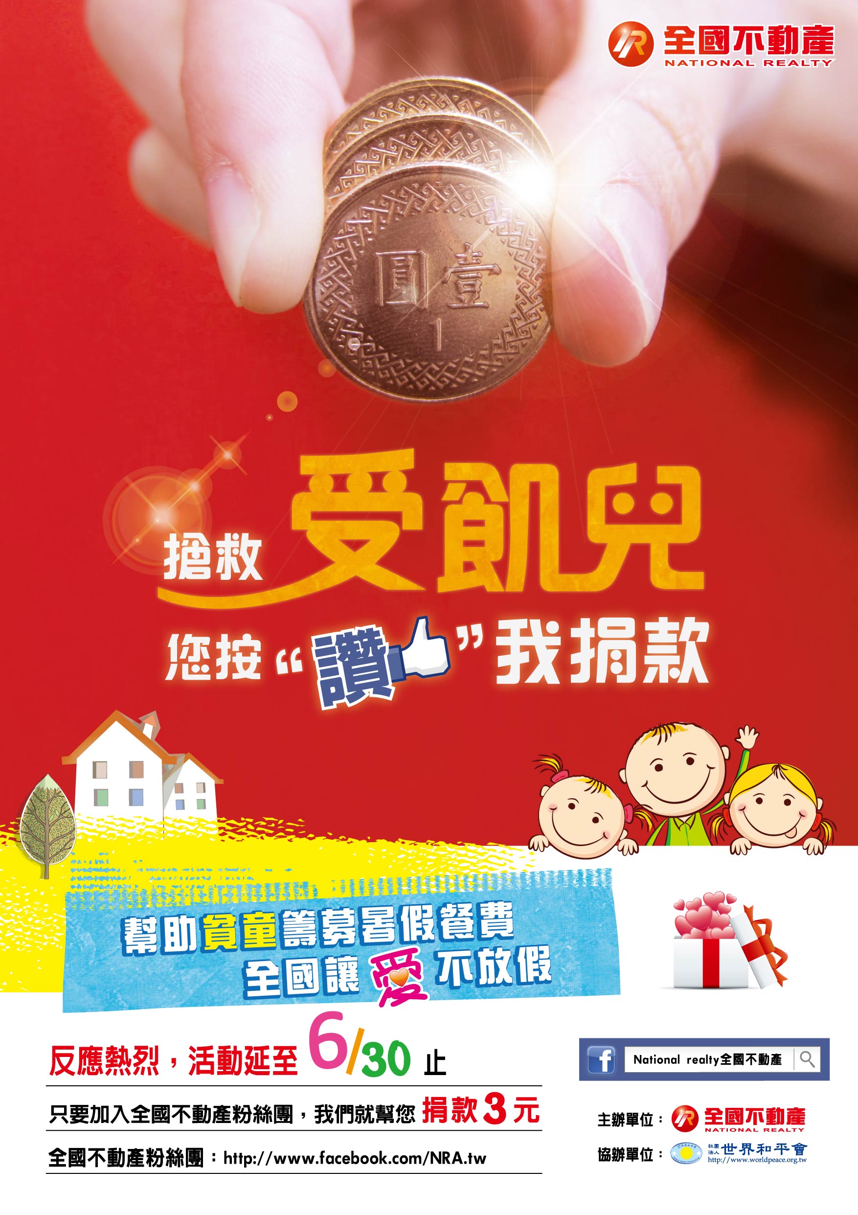 【全國】「搶救受飢兒‧你按讚‧全國不動產捐款」活動加碼延期至6/30止!