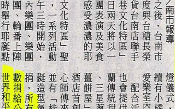 【中華日報報導】336巷文化特區 16日點燈336巷文化特區 16日點燈 2010.12.08/中華日報/黃微芬/南市報導 繼館慶活動之後,台南市立文化中心再度與台糖長榮酒店及德安百貨台南店聯手打造「三三六巷文化特區」,十一、十二日兩天將以一系列精彩的樂團表演及美食,邀大家一起感受濃濃的耶誕佳節氣氛。「三三六巷文化特區」聖誕點燈音樂會,一系列活動將從十一日下午三時開始,由天籟之音室內樂團、樂團樂團、天韻樂團、輪番上陣演出,晚上六時舉行耶誕點燈儀式,十二日下午三時起續有小橘子爵士樂團及府城愛樂室內樂團表演。配合活動,台糖長榮酒店也會提供多種美食,包含荷蘭傳統甜甜球、法式烤布蕾、三星蔥捲等,另有義賣「薑餅屋」親子教學活動,由酒店首創金紙蛋糕達人的點心師傅來教大家蓋薑餅屋;並有「桂圓熱薑湯」與「聖誕造型氣球」讓民眾隨意樂捐,所有義賣代收款項將全數捐給公益團體「社團法人世界和平會」。