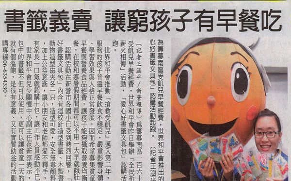 【中華日報報導】搶救受飢兒 愛心書籤認購踴躍 搶救受飢兒 愛心書籤認購踴躍 2010.12.06/中華日報/翁聖權/新營報導 為籌募南區一六五位受飢兒早餐經費,世界和平會昨在新營市舉辦「全民祈福‧『新』火相傳」歲末園遊會,其中愛心好書籤文具包認購活動獲得各國小熱烈響應。和平會歡迎民眾踴躍認購愛心捐助受飢兒,認購專線(○六)六三五四三三○。 世界和平會兒少關懷中心副主任范新淳表示,文具包中的書籤不但可以使用,更可以讓貧童一天的開始就有個溫飽,認購愛心書籤是個很有意義、又對受飢兒很有實質助益的活動。登記現場常出現人擠人的畫面,小朋友互約做愛心,忘記帶錢還不忘找老師幫忙;甚至有家長一口氣就認購了十包,都讓現場的工作人員感動不已。 范新淳指出,此認購活動在新營市各國小已受到熱烈迴響,「愛心好書籤文具包」內含有迴紋針造型書籤、木製書籤、動物造型磁夾各一只,造型可愛,安全無毒顏料上色,加上公益意涵,讓小朋友和老師們都愛不釋手,反應熱烈。 和平會推動「搶救受飢兒」已經邁入第二年,有鑑於服務的孩子當中,普遍早餐飲食不穩定,嚴重影響其身體發育、學習效果與人格正常發展,故發起「搶救受飢兒」計畫,以募集貧童愛心早餐與營養食品的經費,讓孩子們能夠攝取營養均衡的早餐,不論在校或寒暑假期間都可以吃早餐,不用整個上午餓著肚子。
