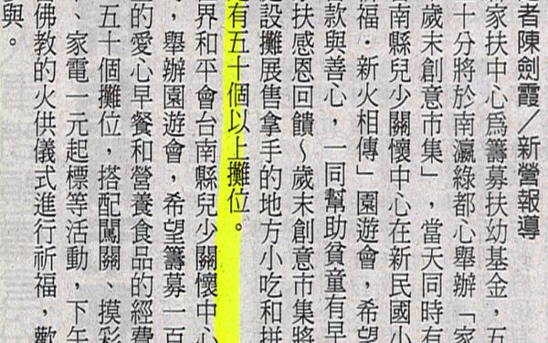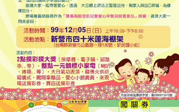 【中華日報報導】家扶創意市集 週日擺攤 家扶創意市集 週日擺攤 中華日報/2010.12.03/陳劍霞/新營報導 縣家扶中心為籌募扶幼基金,五日上午九時三十分將於南瀛綠都心舉辦「家扶感恩回饋~歲末創意市集」,當天同時有世界和平會台南縣兒少關懷中心在新民國小前辦「全民祈福‧新火相傳」園遊會,希望聚集大眾的善款與善心,一同幫助貧童有早餐吃。 家扶感恩回饋~歲末創意市集將由受扶助家庭設攤展售拿手的地方小吃和拼布包等,預定有五十個以上攤位。 世界和平會台南縣兒少關懷中心則於上午十時,舉辦園遊會,希望籌募一百六十五名貧童的愛心早餐和營養食品的經費,現場有四、五十個攤位,搭配闖關、摸彩、填寫祈福卡、家電一元起標等活動,下午二時還有藏密佛教的火供儀式進行祈福,歡迎大家共同參與。
