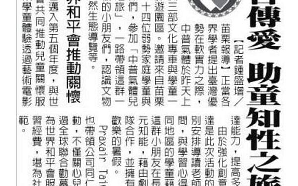 正當各界學者提出臺灣優勢在軟實力之際,中普氣體於昨日上午,提供三部文化專車與學童一起賞電影遊園區。邀請來自苗栗縣一百一十四位弱勢家庭學童與志工夥伴們,參加「中普氣體兒童知性之旅」,一路帶領這群一至六年級的小朋友們,認識文物文化與自然生態導覽等。 與世界和平會推動關懷 今年已邁入第五個年度,與世界和平會共同推動兒童關懷服務,帶領學童體驗透過藝術電影賞析,深化學童藝文領域、語文知能與表達能力,提高多元學習的興趣。 由於強化創意思維與語言的表達是此次活動的主要重點,故特別安排導讀老師引導學生自發提問,與學習心得成果分享,讓不同地區的學童藉此進行交流,讓這群小朋友在長假期間,啟發多元知能,藉由劇情創意發想、團隊合作,並擁有一個充滿知性與歡樂的暑假。 Praxair Taiwan總經理陳俊良也帶領公司同仁一起與小朋友互動,不僅關心兒童的教育,更透過全球聯合勸募捐助八千美金作為世界和平會服務貧童的教育學習經費,堪為社會責任實踐的典範。(記者鍾盛增/苗栗報導) 剪報