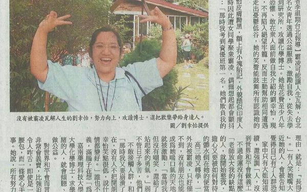 沒有被霸凌瓦解人生的劉幸怡,努力向上,攻讀博士,還把歡樂帶給身邊人。圖/劉幸怡提供 霸凌可能讓人生瓦解,台北卻有一名女青年透過公益服務、激勵自我,從失去學習興趣到研究所,攻讀化學博士。她 是花費至少八年才克服恐懼、敢在眾人面前做自我介紹的劉幸怡,現在的她,不再陷入絕望牢籠,反而主動幫助相同遭遇的朋友走出憂鬱低谷,她的笑聲能鼓舞所有 認識她的人。 劉幸怡皮膚黝黑,額上有小塊胎記,外貌酷似印度人,高一時因此遭女同學聚眾霸凌,偶爾想起都會顫抖,她說:「那時我考到資優班第一名,她們欺負我的理由, 就是:『長得像新移民,憑什麼成績這麼好?』。」有人笑她嘴大,可以一口吃下整個便當,想親近她的人,會被告知「小心被傳染,變成妖怪。」她覺得自己有了 人群恐懼症,有人靠近立刻崩潰。 家中只有大姐知道她的情形,不只幫她辦理轉學手續,還強調「人,沒有妳想得那麼壞」,假日再帶她到世界和平會做義工。 不過命運沒有這麼快放過她,就讀第二所學校時,「老師放大我的缺點,並把我當空氣,想討老師歡心的人,就開始整我,每天上學的重心不是學習,而是擔心又要被如何對待。」印象最深的,是有人把廁所的髒水倒在她的便當裡。 高三她又轉學,一年換一所學校,依舊因為內向、外表被霸凌,只好催眠、告訴自己:「我看不到、聽不到,沒有朋友也能活下去。」此時「世界和平會」成為她喘口氣的天地,她回憶,第一次到老人院服務就被激勵:「當時我拿著麥克風卻不敢說話,大家不但沒有嘲笑,還給了熱烈掌聲,說我至少有從位子上站起來的勇氣。」弱勢孩子則是她的另類暖暖包:「不管日子多苦,他們都笑得出來,感覺很溫暖。」 不敢接觸人群,和平會讓她坐服務台,學習互動,「那時我又要崩潰了,好多人找我問東西。」可是現在,沒有人不把開朗與她畫上等號,會內義工說:「幸怡笑點 很低,說什麼都哈哈大笑,連帶著所有人心情都變好。」誰也不信曾經沒有一件事對她來說有意義,滿腦子在想「為什麼人們要加害她?」 嘉南藥理科技大學研究所畢業後,劉幸怡攻讀師範大學化學博士,求學過程中,遇到被霸凌或有負面情緒的人,就會傾聽、分享自己的遭遇,並邀他們一起做公益。 對世界和平會而言,她是不可多得的幫手,因為她非常會義賣,比強迫推銷的人業績還要好,用心程度令人咋舌,即使是一瓶礦泉水,她也能說到年輕人掏腰包,而一條愛心手帕,只有她能道出背後的愛情故事。她說,所有努力都是希望人們因此更關心弱勢。(記者李祖翔台北報導)原始剪報