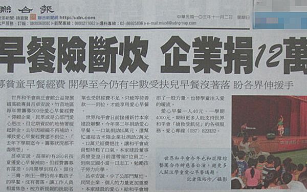 【聯合報】愛心早餐險斷炊 企業捐12萬拋磚