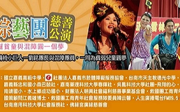 全國聞名的身障團體─混障綜藝團,由團長劉銘先生帶領,與世界和平會「貧童偏鄉圓夢計畫」合作,將於近2個月內,在國內舉辦第一次的全國巡迴公演。不僅圓了團員長期期盼能舉辦全國巡迴公演的夢想,也幫助和平會所扶助的貧弱孩子,勇敢追夢,重拾圓夢的勇氣!此次首度巡迴公演第一站,將於11月30日星期六晚上6點,在嘉義高中樹人堂舉行!現場除了由混障綜藝團的團員們精湛的歌唱和舞蹈演出,還有和平會扶助「圓夢計畫」的嘉義縣水上鄉忠和國小小朋友,所帶來的森巴鼓表演,現場更有榮獲總統教育獎的5年級許瀞方,也是鼓隊靈魂人物,他將捐助1萬元獎金支持圓夢計畫,活動內容精采,高潮迭起,絕對讓掌聲不斷。當天活動由人生廣播電台主持人陳石定老師主持,嘉義市肢體障礙服務協會張天瑞理事長也邀請會裡的會員,共襄盛舉。嘉義高中黃義春校長也到場勉勵小朋友,對於有心想要求進步、想要成長的小朋友,社會都應該予以支持,不應該因為家境貧窮,就斷了孩子未來的路,希望小朋友也要把握機會,朝夢想勇往直前。世界和平會副會長范新淳表示,相當感謝來自社會各個善心熱情的民眾,以及各單位的支持,感恩嘉義市政府贊助摸彩品腳踏車3台,獎項包羅萬象,讓這場活動得以圓滿完成!這次不止一圓團員的夢,也給予孩子圓夢的動力,開演後將邀請社會大眾攜伴欣賞,讓綜藝團團員們的生命故事,鼓舞現代人要勇敢活出希望。愛心專線:05-225-5164。(記者孫慶璋)
