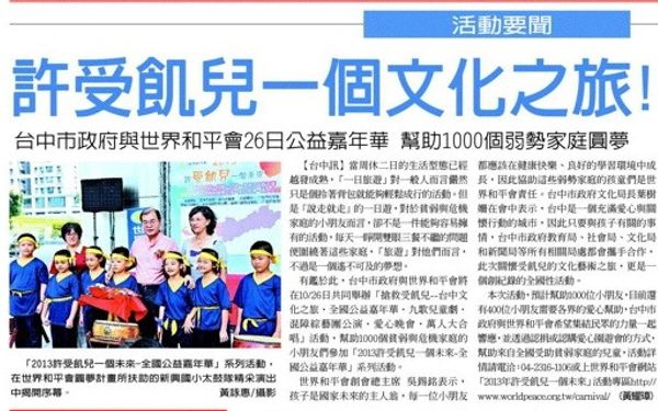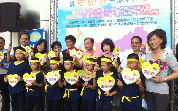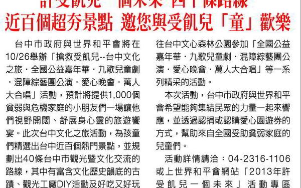 台中市政府與社團法人世界和平會將在10月26日舉辦「許受飢兒一個未來」台中文化之旅‧快樂一日遊‧全國公益嘉年華‧九歌兒童劇‧混障綜藝團公演‧愛心晚會‧萬人大合唱活動。快樂一日遊活動,精選出台中目前近百個非常熱門的景點,規劃出40條台中城市觀光暨文化交流的路線,帶來自全省貧弱與危機家庭的孩童們至台中做文化之旅,開闊視野,讓「旅遊」對貧弱與危機家庭的小朋友們不再只是一個生冷僵硬的名詞、而是一種動態的實際體驗! 當天於台中文心森林公園舉辦的「全國公益嘉年華‧九歌兒童劇‧混障綜藝團公演‧愛心晚會‧萬人大合唱」有近200個愛心攤位攜手做公益,另外還邀請凌華教育基金會執行長劉銘先生所領軍的「混障綜藝團」和國內最具規模與歷史的「九歌兒童劇團」等眾多知名表演團體共襄盛舉!同時,圓滿劇場內更舉辦一聯串精彩表演,最後將在點燃愛心之燈後,以萬人大合唱高潮畫下溫馨的圓滿句點。台中市政府與世界和平會精心規劃的「許受飢兒一個未來」系列活動,現在誠摯邀請您與台中市長胡志強先生和本會代言人趙婷小姐搶先一起暢遊大台中!一同愛心LET’S 〝購〞!(公民記者林富山)