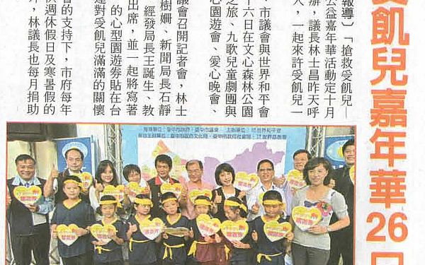 「搶救受飢兒-台中文化之旅」全國公益嘉年華活動定十月二十六日在台中市舉辦,議長林士昌昨天呼籲所有想付出愛心的人,一起來許受飢兒一個美好的未來。這次活動是由市府、市議會與世界和平會共同舉辦,定十月二十六日在文心森林公園舉辦,內容包含文化之旅、九歌兒童劇團與混障綜藝團表演、愛心園遊會、愛心晚會、萬人大合唱等。主辦單位昨天在市議會召開記者會,林士昌、市府文化局長葉樹姍、新聞局長石靜文、社會局長王秀燕、經發局長王誕生、教育局長吳榕峰等人都出席,並一起將寫著「許受飢兒一個未來」的心型園遊券貼在台中市地圖上,象徵表達對受飢兒滿滿的關懷及祝福。(記者鍾麗如)原始剪報「所有孩子都是我們的寶,只要有需要都可以主動找校長與老師幫忙」!吳榕峰說,在市議會的支持下,市府每年花費三億八千萬元提供週休假日及寒暑假的午餐給弱勢學生。此外,林議長也每月捐助五萬元,並連續一年。