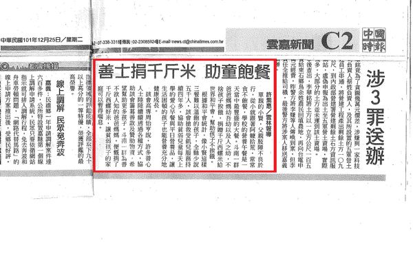 【中時電子報】善士捐千斤米 助童飽餐