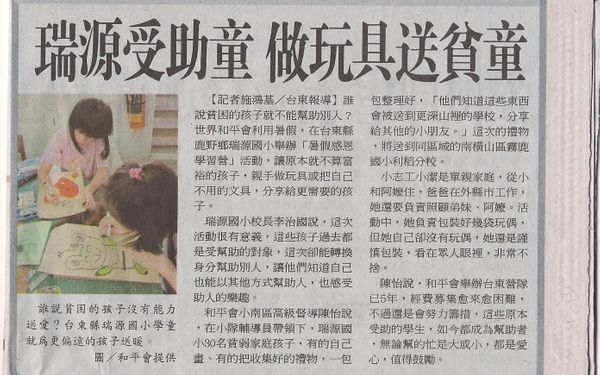 照片說明:誰說貧困的孩子沒有能力送愛?台東縣瑞源國小學童就為更偏遠的孩子送暖 誰說貧困的孩子就不能幫助別人?世界和平會利用暑假,在台東縣鹿野鄉瑞源國小舉辦「暑假感恩學習營」活動,讓原本就不算富裕的孩子,親手做玩具或把自己不用的文具,分享給更需要的孩子。 瑞源國小校長李治國說,這次活動很有意義,這些孩子過去都是受幫助的對象,這次卻能轉換身分幫助別人,讓他們知道自己也能以其他方式幫助人,也感受助人的樂趣。和平會小南區高級督導陳怡說,在小隊輔導員帶領下,瑞源國小30名貧弱家庭孩子,有的自己畫、有的把收集好的禮物,一包包整理好,「他們知道這些東西會被送到更深山裡的學校,分享給其他的小朋友。」這次的禮物,將送到同區域的南橫山區霧鹿國小利稻分校。 小志工小潔是單親家庭,從小和阿嬤住,爸爸在外縣市工作,她還要負責照顧弟妹、阿嬤。活動中,她負責包裝好幾袋玩偶,但她自己卻沒有玩偶,她還是謹慎包裝,看在眾人眼裡,非常不捨。 陳怡說,和平會舉辦台東營隊已5年,經費募集愈來愈困難,不過還是會努力籌措,這些原本受助的學生,如今都成為幫助者,無論幫的忙是大或小,都是愛心,值得鼓勵。(聯合報 高屏東綜合新聞B2)