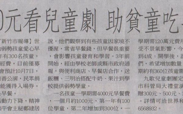 【聯合報】捐300元看兒童劇 助貧童吃早餐