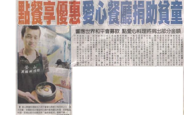 照片說明:釜山異國料理館加入和平會愛心商家已有四年之久,這次活動,老闆設定店裡全州石鍋拌飯為愛心料理,民眾點此料理,即捐出部分金額支持「搶救受飢兒」服務方案。 響應世界和平會募款,點愛心料理將捐出部分金額 面對油電雙漲壓力,世界和平會台南地區長期協助四百零二位貧童早餐也受到影響!近日舉辦感恩餐會,僅募得一半的經費,現在台南市愛心餐廳也加入搶救,讓民眾只要來到指定餐廳,不僅可以享受現場優惠,餐廳將捐出部分金額幫助小朋友,讓民眾不僅吃美味,也能做善心,幫助貧童遠離挨餓! 以做異國料理著名釜山異國料理館,加入和平會愛心商家已有四年之久,店裡放置愛心捐款箱,一直都有零錢在裡面,絕不空著。這次活動,老闆依舊義不容辭的加入愛心商家,設定店裡全州石鍋拌飯為愛心料理,民眾點此料理,即捐出部分金額支持「搶救受飢兒」服務方案。 和平會台南市高級專員周怡亨表示,目前加入這項愛心活動行列店家們有Spot-Life手作柴窯PIZZA、咖啡星異國料理-育德總店、隨光呼吸、釜山異國料理館、鬥牛士二鍋-成大店/中山店,善舉讓所有的工作人員都大為感動!面對暑假尚有一百萬元「暑期餐費」缺口,仍需要社會大眾繼續大力支持!這次公益餐廳的加入,讓此缺口又多了一個填補的力量,長期營養餐點的提供,幫助貧童攝取足夠的能量。 世界和平會邀請還想加入「公益餐廳」行列的善心商家,撥打(0六)二一五0五七五,為在地孩子盡一份心力。欲得知愛心商家的訊息,請上FB尋找「世界和平會-嘉南高屏區兒少關懷中心」。 ﹝記者鄭德政南市報導﹞