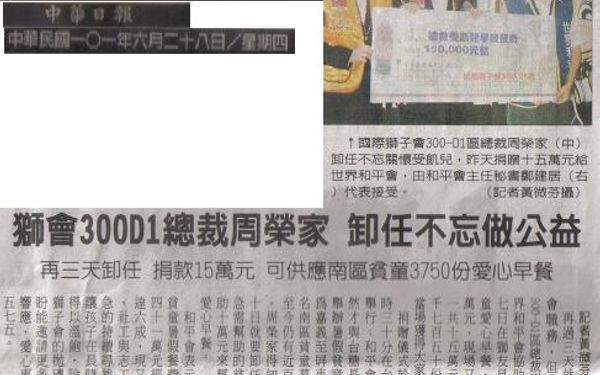 照片說明:國際獅子會300-D1區總裁周榮家(中)卸任不忘關懷受飢兒,昨天捐贈十五萬元給世界和平會,由和平會主任秘書鄭建居(右)代表接受。(記者黃微芬攝)網站:http://www.cdns.com.tw/20120628/news/nxyzh/T90009002012062718501142.htm 再過三天就要卸下獅子會職務,但國際獅子會 300-D1區總裁周榮家心繫世界和平會協助的貧童,廿七日在獅友見證下捐贈貧童愛心早餐,原本只有十萬元,現場又加碼五萬,一共十五萬元約可供應三千七百五十份愛心早餐,當場獲得大家的熱烈掌聲。 捐贈儀式於昨天上午十時三十分在台糖長榮酒店舉行;和平會在六月初雖然才與台糖長榮酒店合作舉辦暑假貧童感恩餐會,為嘉義至屏東共四百零二位南區貧童募早餐費,但至今仍有近百萬元的缺口,周榮家得知後,雖然三十日就要卸任,還是不忘急需幫助的貧童,馬上捐助十萬元來幫助貧童購買愛心早餐。 和平會表示,今年南區貧童暑假餐費共需要二百四十一萬元經費,目前只達六成,現又已進入暑假,社工與志工們都非常焦急的持續尋找捐助管道,讓孩子在長時間的暑假中得以溫飽,除了非常感謝獅子會的拋磚引玉,也期盼能邀請更多的民眾共同響應,愛心專線二一五○五七五。(記者黃微芬報導)
