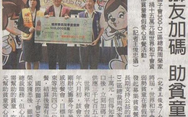 【自由時報】獅友加碼 助貧童吃飽