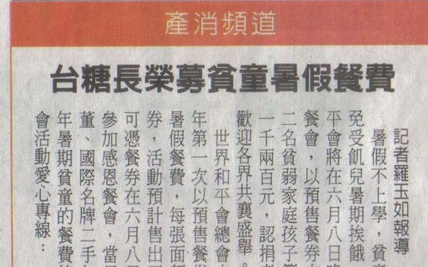 【中華日報】台糖長榮募貧童暑假餐費