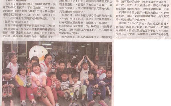 【中國時報報導】募捐送鞋 世界和平會助貧童 募捐送鞋 世界和平會助貧童2008/01/19/王志宏/潮州報導 世界和平會發起募集鞋子幫助貧弱孩童,預計幫助1000名孩子,不過目前僅由1名不願具名的國語日報老師熱心贊助120雙,其中潮州地區分配到30雙,十八日這些鞋子送到孩子手中,小朋友穿上之後興奮的將腳舉起說,「看,這是我的新鞋子耶!」 世界和平會長期輔導貧弱家庭孩童,之前到台東舉辦營隊,發現貧困學生英英的鞋子如此破舊,但英英是單親家庭,母親在台北工作很少回家,都跟著阿嬤相依為命,省錢過日子,想買雙鞋子更不可能。當時其他縣市社工員也在服務過程中,發現貧困家庭大多花費在三餐溫飽及學費上,孩子想擁有舒服又漂亮的鞋,只能縫縫補補繼續穿。 有鑑於此,和平會邀約善心天使與鞋店老闆,用愛打造孩子新鞋,讓孩子可以快樂過節。發送範圍含嘉義縣市、台南縣市、高雄縣市、屏東縣市與台東縣市,預計1000雙,每雙鞋子500元,目前已籌募30雙15000元,由不願具名的老師熱心贊助。 昨天就讀小一的小P與其他孩子一看到新鞋子,迫不及待的試穿,臉上洋溢著幸福表情,社工說,原本小P只會講台語,髒兮兮的鞋子和衣服與喜歡學豬叫,是與他接觸的第一印象,來到和平會像小猴子一樣跑來跑去。小P興奮的說,舊鞋子從幼稚園穿到現在,是阿嬤買的,能有新鞋子穿很高興。 這些鞋子分為3次發送,先由社工員訪視,詢問孩子的需要及鞋號,再送給孩子,最慢在兒童節前,發送以偏遠地區孩子優先,不過尚待熱心人士贊助,洽詢電話:7806286周小姐。