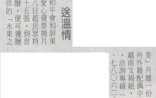 【自由時報報導】愛心發票換月曆 送溫情 愛心發票換月曆 送溫情自由時報/記者羅欣貞/2007.12.27潮州:社團法人世界和平會和屏東縣稅捐稽徵處,舉辦「愛心發票換月曆」活動,自本月二十八日起民眾持十一月、十二月份發票十五張,到世界和平會潮州鎮會館捐贈,便可獲贈由屏東縣稅捐稽徵處提供的「水果之美」月曆一份,此外,世界和平會潮州外籍配偶中心也免費提供外籍配偶越南文報紙,提供外籍配偶家鄉資訊,洽詢專線(O八)七八九一七二六、七八O六二八六。