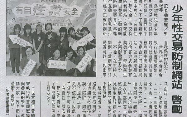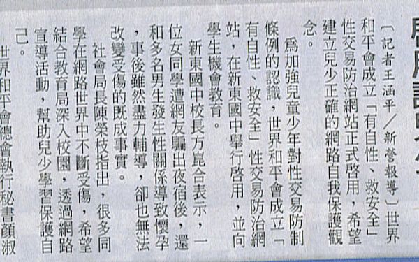【中華日報報導】少年性交易防治網站 啟動 少年性交易防治網站 啟動 中華日報/記者翁聖權/新營報導/2007.12.8 為加強兒童少年對性交易防制條例的認識,世界和平會昨天下午假新東國中成立「有自性‧救安全」性交易防治網站,希望能藉由豐富生動的網路動畫與青少年進行互動,讓兒童少年建立正確的網路自我保護的概念。昨天現場由世界和平會總會執行秘書顏淑娟、縣府社會局長陳榮枝與新東國中校長方崑合共同啟動網站,並與新東國中學生以搶答的方式參與有獎徵答,帶動學生參與的熱烈氣氛。不過,在主持人問到「當網友問到是否可以一起出來見面時,是應該要(一)堅決地拒絕。(二)那麼聊得來,去一下應該沒關係。(三)一個人去太危險,下課後找同學一起去。」,結果現場學生並沒有都回答「應堅決地拒絕」,可見學生對於網路自我保護的概念仍然不夠清楚。世界和平會總會執行秘書顏淑娟表示,網路的世界很精彩,但也讓很多的孩子誤入陷阱,如果遇見了違法之事,就更不值得。因此,希望學生可以透過「有自性‧救安全」網站的資訊,來了解簡單的條例與上網的安全。新東國中校長方崑合則提醒同學,上網應有保護自己的概念,才不會造成遺憾。他說,之前曾經協助一位同學,因為這位女同學在網路上交了一位網友,結果網友欺騙她外出夜宿,並和多名男生發生性關係,也讓這位女同學懷孕,最後造成不可抹滅的傷痕,雖然事後已盡力做輔導,可是卻也無法再改變受傷的事實。社會局長陳榮枝則表示,有很多同學,因為單純的希望在網路上交朋友,但是卻很容易受騙,造成很多同學在網路的世界中不斷的受傷,因此希望此次的活動結合教育局深入校園,期許透過政府、學校與善心機關團體的參與,讓這次的網路宣導活動,可以幫助更多的兒童少年正確認識性交易防制的知識,並學習如何保護自己。