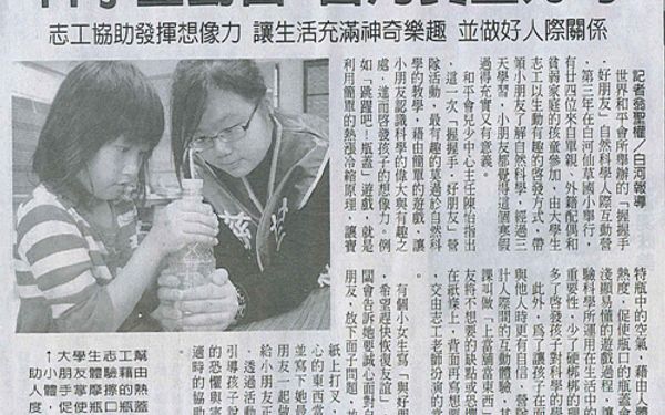 【中華日報報導】科學互動營 白河貧童好奇 中華日報/2008.02.02/翁聖權/白河 世界和平會所舉辦的「握握手‧好朋友」自然科學人際互動營,第三年在白河仙草國小舉行,有廿四位來自單親、外籍配偶和貧弱家庭的孩童參加,由大學生志工以生動有趣的啟發方式,帶領小朋友了解自然科學,經過三天學習,小朋友都覺得這個寒假過得有充實又有意義。 和平會兒少中心主任陳怡指出,這一次「握握手‧好朋友」營隊活動,最有趣的莫過於自然科學的教學,藉由簡單的遊戲,讓小朋友認識科學的偉大與有趣之處,進而啟發孩子的想像力。例如「跳躍吧!瓶蓋」遊戲,就是利用簡單的熱漲冷縮原理,讓寶特瓶中的空氣,藉由人體手掌的熱度,促使瓶口的瓶蓋會跳動,淺顯易懂的遊戲過程,讓孩子體驗科學所運用在生活中的普遍與重要性,少了硬梆梆的理論,卻多了啟發孩子對科學的學習。 此外,為了讓孩子在面對自己與他人時更有自信,營隊裡也設計人際間的互動體驗,其中一堂課叫做「上當舖當東西」。小朋友將不想要的缺點或恐懼的事寫在紙條上,背面再寫想要的東西,交由志工老師扮演的當舖老闆。 有個小女生寫「與好朋友吵架,希望趕快恢復友誼」,當舖老闆會告訴她要誠心面對自己與好朋友,放下面子問題,並請她在紙上打叉,表示擔心的東西當掉了,並寫下她最想與好朋友一起做的事,給小朋友正面鼓勵,透過活動設計,引導孩子說出心中的恐懼與害怕,並適時的協助小朋友。