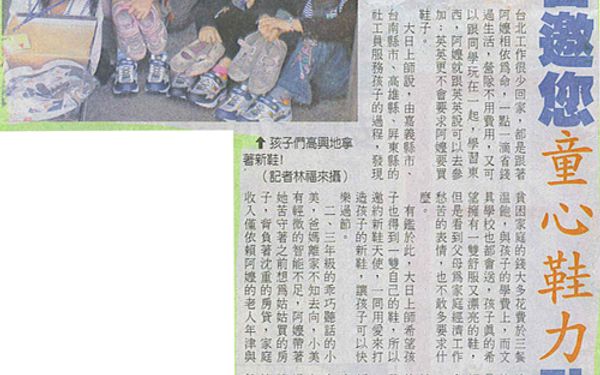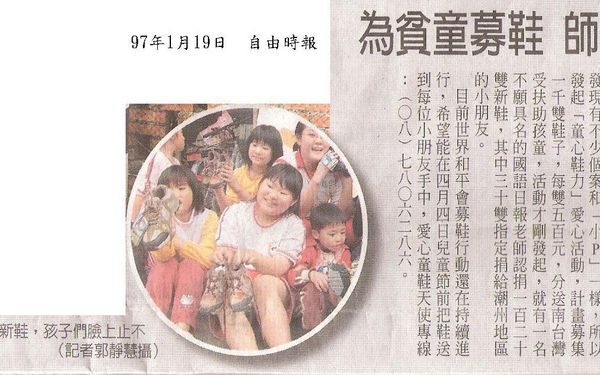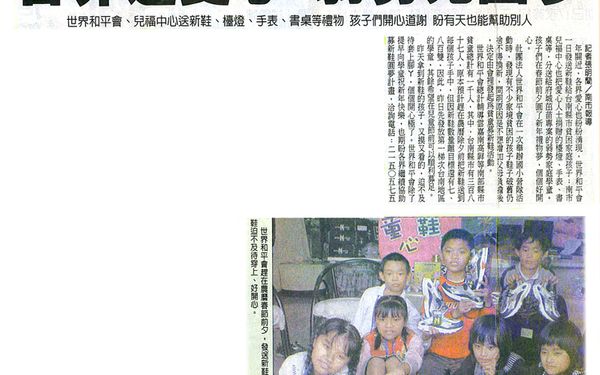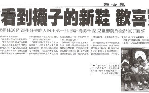 【聯合報報導 】 不會看到襪子的新鞋 歡喜穿上 不會看到襪子的新鞋 歡喜穿上世界和平會發起捐鞋活動 潮州分會昨天送出第一批 預計籌募千雙 兒童節前為全部孩子圓夢 2008-01-19/聯合報/C1版/林順良/潮州報導世界和平會社工員發現不少受助孩童穿著破舊鞋子上學,發願過年前送給孩子新鞋,而發起「童心鞋力一起來」,獲初步迴響,「但仍有不少孩子等著新鞋穿」,和平會期待與善心人士努力,一圓孩子的新年新鞋夢。「在這裡,有的孩子真的只想要一雙不會破到看到襪子的新鞋!」嘉南高屏東區區會長韓駿逸感傷地說。昨天他與社工員送出第一批募集的新鞋,受助孩童脫掉斑駁不堪舊鞋,快樂地把腳丫子放進新鞋後,社工員開心地笑了,孩子們笑得更燦爛。「總算有新鞋可穿了!我真的很高興!」小比(化名)來自隔代教養家庭,他不捨地脫掉骯髒的「布希鞋」,這是阿嬤帶他逛夜市時買回來的便宜貨,沒想到從此成為他上下學、居家的夥伴,社工員看得心酸。韓駿逸說,他們預計在嘉義、台南、高雄、屏東及台東等縣市籌募1000雙新鞋,然後發送給需要新鞋的貧困孩子們,1名在國語日報教書的老師,聽到消息後,捐出120雙,屏東縣分配到30雙。和平會潮州分會昨天把第1批新鞋送給受助孩童,預計下學期開學前送出第2波,第3波也是最後1次,則在兒童節以前送出,讓規劃的1000名幼童,至少在兒童節以前「統統有新鞋穿」。和平會扶助的幼童,來自貧困、單親、失怙或隔代教養的家庭,捐獻者可洽專線7806286周小姐,每雙新鞋500元。