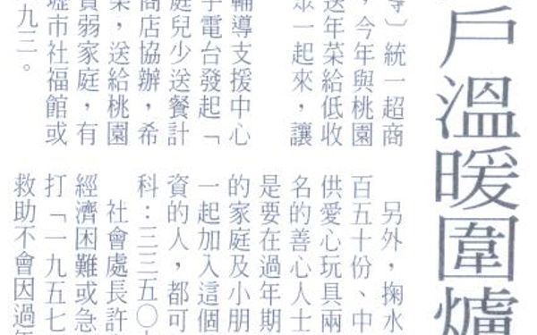 【人間福報報導】貧弱兒少團圓飯 有請您上菜 貧弱兒少團圓飯 有請您上菜 農曆年節將至,家家戶戶添購年貨準備過年、準備享受溫馨喜悅的團圓晚餐時,卻有些家庭艱辛地過日子,倍覺孤單。這些家境貧困及缺乏親人照顧的家庭與兒少,需要社會大眾給予關懷。社團法人世界和平會長期投入貧弱兒少的照顧,於九十三年、九十四年起承接桃園縣政府與新竹縣政府主辦的「兒童少年社區照顧輔導支援中心」,服務六至十五歲低收入戶、清寒、單親以及隔代教養的貧弱兒少。本次世界和平會與桃園縣政府、新竹縣政府與環宇廣播電台共同發起「寒冬送暖│九十七年貧弱家庭兒少送餐計畫」,邀請愛心聯盟商店主辦與萊爾富便利商店協辦,希望能為桃園縣與新竹縣內一百個貧弱家庭籌募年節禮盒、團圓年菜。詳情可電洽:(○三)三○一三三九三鄧小姐。
