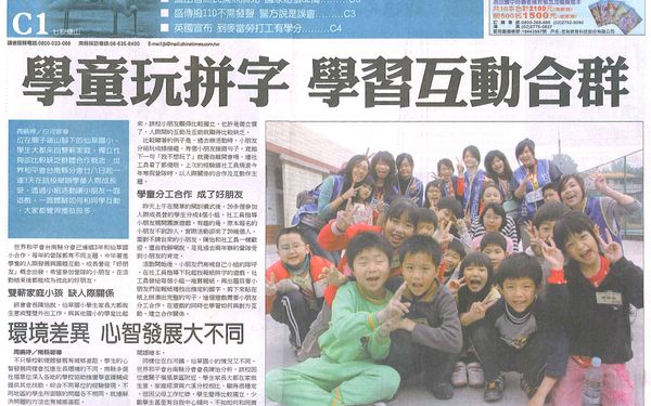 【中國時報報導】學童玩拼字 學習互動合群 位在關子嶺山腳下的仙草國小,學生大都來自雙薪家庭,獨立性夠卻比較缺乏群體合作概念,世界和平會台南縣分會廿八日起一連3天在該校舉辦學童人際成長營,透過小組活動讓小朋友一面遊戲,一面體驗如何和同學互動,大家都覺得獲益良多。 世界和平會台南縣分會已連續3年和仙草國小合作,每年的營隊都有不同主題,今年著重學童的人際發展與團體互動,成長營從「好朋友」概念出發,希望參加營隊的小朋友,在活動結束後都能成為彼此的好朋友。雙薪家庭小孩 缺人際關係 該會會長陳怡說,仙草國小學生家長大都做生意或雙雙外出工作,與其他國小的學童比起來,該校小朋友顯得比較獨立,也許是獨立慣了,人際間的互動及互助就顯得比較缺乏。 比較顯著的例子是,過去辦活動時,小朋友分組玩成語接龍,有個小朋友接錯句子,竟拋下一句「我不想玩了」就獨自離開會場,連社工員看了都傻眼,上次的經驗讓社工員規畫今年寒假營隊時,以人際關係的合作及互動作主題。學童分工合作 成了好朋友 昨天上午在簡單的開訓儀式後,20多個參加人際成長營的學生分成4個小組,社工員指導小朋友展開團康遊戲,有趣的是,原本報名的小朋友不到20人,實際活動卻來了20幾個人,面對不請自來的小朋友,陳怡和社工員一樣歡迎,還自我解嘲說,足見過去兩年辦的營隊受到小朋友的肯定。 活動開始後,小朋友們高喊自己小組的隊呼,在社工員指導下玩起找報紙拼字的遊戲,社工員發給每個小組一堆舊報紙,再出題目要小朋友們從報紙裡找出指定的國字,剪下來貼在紙上拼湊出完整的句子,這個遊戲需要小朋友分工合作,在遊戲的同時也學習如何與對方互動,建立合作關係。