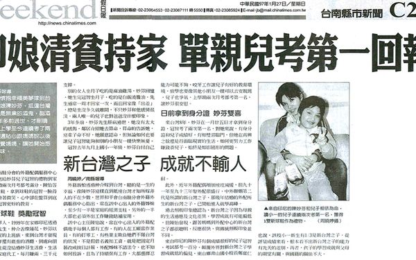 【中國時報報導】印娘清貧持家 單親兒考第一回報 印娘清貧持家 單親兒考第一回報中國時報C2/2008.01.27/周曉婷/南縣報導19歲那年,懷抱幸福美夢嫁到台灣的印尼新娘陳妙芬,抵達台灣才知道丈夫是無業的酒鬼,酗酒的丈夫在3年多前過世。才剛讀小一的兒子上學至今連續考了兩次第一名,還貼心跟媽媽說以後要工作賺錢養媽媽,讓她開始感受幸福的滋味。 世界和平會台南縣分會的外籍配偶服務中心主任陳怡,帶著送給妙芬兒子冠智的禮物到家裡,因為冠智連續兩次月考都考滿分,陳怡答應送給他1雙新球鞋,拿到球鞋的冠智一臉得意,陳妙芬臉上掛著微笑,心中卻在盤算到底要怎麼做才能給冠智更好的教育。 世和會贈新球鞋 獎勵冠智 陳妙芬是印尼華人,1999年在家鄉印尼透過仲介嫁給台灣的先生,仲介舌燦蓮花,妙芬以為先生是工作穩定的上班族,來到台灣才發現,先生不但沒工作還有嚴重的酒癮,到處向朋友借錢買酒,先生從沒給過妙芬生活費,生活所需全靠妙芬作家庭代工,每月賺兩、三千元支撐。 別的女人坐月子吃的是麻油雞湯,妙芬回憶,她生完冠智坐月子,吃的是白飯澆醬油,先生通常一周才回家一次,而且回家像「出差」,總是坐沒多久就離開,不只妙芬和他感情很淡,兩人唯一的兒子也對爸爸沒什麼印象。 3年多前,妙芬先生肝病過世,她沒有太大的感傷,鄰居介紹她去算命,算命的告訴她,這輩子命不好,她願意認命,但無論如何也要讓兒子冠智能夠和別的小朋友一樣快樂無憂。 冠智去年九月上國小一年級,妙芬自忖自己能力可能不夠,咬牙工作讓兒子有好的教育環境,放學也要像其他小朋友一樣可以去安親班,兒子也爭氣,上學期兩次月考都考第一名,讓妙芬很安慰。 日前拿到身分證 妙芬雙喜 來台灣8年,妙芬在一月廿五日才拿到身分證,冠智考了兩次第一名,對她來說,有身分證和兒子成績好,有如雙喜臨門,但她在高興之餘還是得面臨現實的生活,如何更努力工作賺錢養兒子,始終是如影隨形的問題。