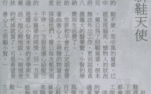 【人間福報報導】當孩子的新鞋天使 當孩子的新鞋天使 人間福報/2008.3.7/柯柯根據內政部兒童局公布的研究報告,台灣生活在「中低收入水準」貧窮邊緣的兒童超過三十六萬名,但政府認定的低收入戶人口僅有八至九萬戶,許多孩子無法納入官方的社福體系接受補助與照顧,只能依靠民間的社福資源和社會大眾的愛心度過難關。住在大園的小賢是典型的低收邊緣兒童,從未感受過父母關愛的他,自小就由舅公、舅婆照顧,三人互相扶持、相依為命,如今舅公行動不便,而中風的舅婆,已經呈現腦死、植物人的狀況,舅公為了照顧舅婆,根本無法外出工作,更別說是負擔龐大的醫藥費、小賢的學費與生活費了。世界和平會社工定期會帶著由善心人士捐贈的物資去探望他們,舅公每次都哭個不停,一方面是傷心結髮三十年舅婆的病情,另一方面是擔心小賢未來的求學與生活。他心酸地說:「兩個老的死掉就算了,可是希望有善心人士照顧小賢。」社工發現,小賢穿的鞋子,鞋底早已破了好幾個洞,每當下雨天,連續穿好幾天的襪子都會濕掉。小賢只低著頭對社工說:「習慣了!」這些孩子無法決定自己出生的家庭,但他們應該被關愛,過著較妥善生活。世界和平會在桃園縣,預計為像小賢這樣貧困孩子籌募二百五十雙新鞋,於是發起「童心鞋力一起來」,送新鞋幫助貧童的活動,希望能在兒童節來臨前,為孩子實現夢想。世界和平會呼籲社會大眾,能夠擔任孩子們的「新鞋天使」,共同用愛來打造貧童的新鞋,聯絡電話(○三)三○一三三九三社工鄧湘樺。