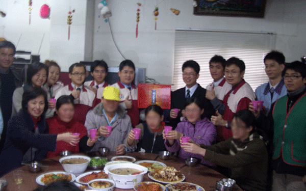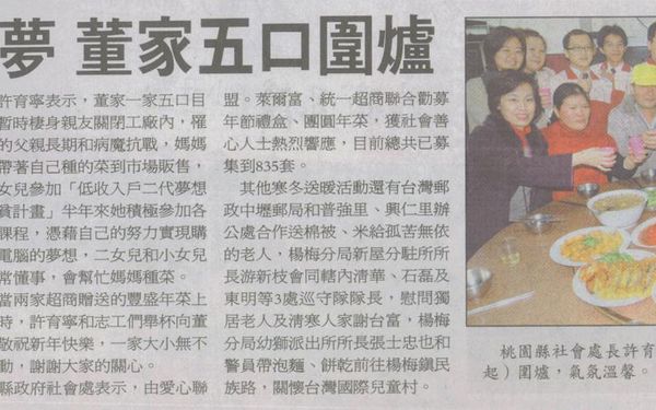 【聯合報報導】實現脫貧夢 董家五口圍爐 實現脫貧夢 董家五口圍爐 聯合報╱2008.2.5/游文寶/中壢 在春節來臨前夕,各地紛舉辦寒冬送暖及圍爐活動,讓貧弱家庭及獨居老人也能享用豐盛年夜飯,過一個溫暖新年。由桃園縣政府社會處會同世界和平會、統一超商桃竹部八德區、萊爾富超商、愛心聯盟超市合作發起的「寒冬送暖,貧弱家庭兒少送餐計畫」活動,昨天下午2時,包括社會處長許育寧、超商代表及愛心志工多人,前往中壢市內定里低收入戶為董姓家庭圍爐。許育寧表示,董家一家五口目前暫時棲身親友關閉工廠內,罹癌的父親長期和病魔抗戰,媽媽則帶著自己種的菜到市場販售,大女兒參加「低收入戶二代夢想脫貧計畫」半年來她積極參加各項課程,憑藉自己的努力實現購買電腦的夢想,二女兒和小女兒非常懂事,會幫忙媽媽種菜。當兩家超商贈送的豐盛年菜上桌時,許育寧和志工們舉杯向董家敬祝新年快樂,一家大小無不感動,謝謝大家的關心。縣政府社會處表示,由愛心聯盟。萊爾富、統一超商聯合勸募年節禮盒、團圓年菜,獲社會善心人士熱烈響應,目前總共已募集到835套。其他寒冬送暖活動還有台灣郵政中壢郵局和普強里、興仁里辦公處合作送棉被、米給孤苦無依的老人,楊梅分局新屋分駐所所長游新枝會同轄內清華、石磊及東明等3處巡守隊隊長,慰問獨居老人及清寒人家謝台富,楊梅分局幼獅派出所所長張士忠也和警員帶泡麵、餅乾前往楊梅鎮民族路,關懷台灣國際兒童村。