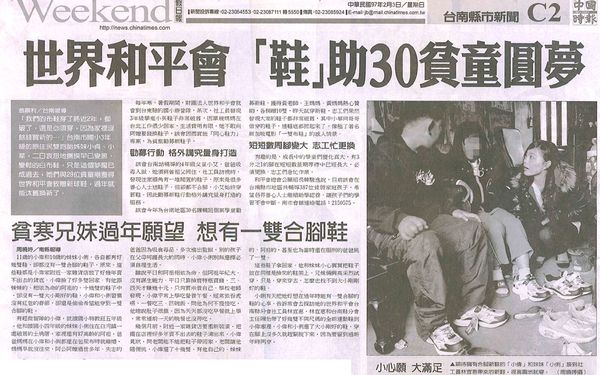 【中國時報報導】世界和平會 「鞋」助30貧童圓夢 世界和平會 「鞋」助30貧童圓夢中國時報C2/2008.02.03/翁順利/台南報導 「我們的布鞋穿了將近2年,都破了,還是必須穿,因為家裡沒餘錢買新的…」台南市國小3年級的原住民雙胞胎姊妹小貞、小華,二日哀怨地撫摸早已變黑、變鬆的白布鞋,只是這個夢魘已成過去,她們與28位貧童剛獲得世界和平會致贈新球鞋,過年就能汰舊換新了。 每年寒、暑假期間,財團法人世界和平會就會到台東縣的國小辦營隊,某次,社工員發現3年級學童小英鞋子非常破舊,因單親媽媽在台北工作很少回家,生活費用有限,她不敢向阿嬤要錢換鞋子,該會因而實施「同心鞋力」專案,為貧童勸募新鞋子。 勸募行動 格外講究量身打造 該會台南站輔導的4年級女童小艾,爸爸吸毒入獄,她須與曾祖父同住,社工員訪視時,發現住家牆角有一堆閒置的鞋子,原來是很多善心人士送鞋子,但卻都不合腳,小艾始終穿舊鞋,因此勸募新鞋行動格外講究量身打造的服務。 該會今年為台南地區30名課輔班個案學童勸募新鞋,獲得黃老師、王媽媽、黃媽媽熱心贊助,各捐贈10雙,昨天試穿新鞋,志工們果然發現大家的鞋子都非常破舊,其中小華向哥哥借穿的鞋子,連鞋底都掀起來了,像極了著名新加坡電影「一雙布鞋」的感人情景。 短短數周腳變大 志工忙更換 有趣的是,成長中的學童們變化真大,有3分之1的腳在短短數星期等待中已經長大,必須更換,志工們急忙作業。 和平會總會公關組長韓駿逸說,目前該會在台南縣市地區共輔導3 87位貧弱家庭孩子,希望各界善心人士繼續助學認養,讓孩子們的學習不會中斷。南市會館連絡電話︰2150575。