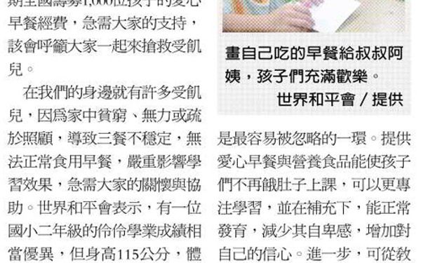 【聯合報報導】徵求愛心早餐達人 每月千元徵求愛心早餐達人 每月千元 聯合報╱2010.10.07/記者黃宣翰/新營報導 「貧童沒有錢吃早餐,需要您的幫助!」世界和平會新營市分會昨天發起「搶救受飢兒」活動,徵求100名愛心早餐達人,每月捐出1000元善款,協助弱勢兒童吃早餐。世界和平會台南區分會長陳怡說,大環境不景氣,捐款約少5成,對於貧困家庭更是困難重重,多少貧困兒童沒有早餐吃或僅僅能喝一杯豆漿果腹。從10月1日起,世界和平會與早餐店、全家、7-11合作共同推出愛心營養早餐,迄今已讓新營區58名貧困兒童擁有一份愛心早餐,受扶助孩子邊笑邊吃,讓人心有所感。世界和平會台南分會另從今年6月開始,積極舉辦台南各大夜市愛心義賣,勸募愛心早餐捐款,希望幫助更多受飢兒,迄今共收到367筆計25萬元,最大筆是台南地檢署15萬元。陳怡指出,和平會社工從後壁、白河、新營陸續推廣愛心早餐,後壁鄉目前和全家合作幫助了13名孩童。全家後壁茄苳店陳靜湘店長說,期待給孩童更多份量、營養的早餐,希望能為社區孩子盡點心力。世界和平會總會主任秘書鄭建居說,希望民國100年來臨前可籌募100名愛心早餐達人,每月1000元幫助一個孩子吃早餐用,有意者可電06-6354330洽詢。