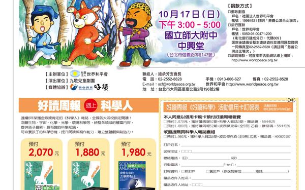 【自由時報報導】募款助弱勢童就學募款助弱勢童就學 自由時報/99.9.16/余雪蘭嘉市:世界和平會嘉義分會辦理「搶救危機兒‧上學GO」助學計畫,共籌募助學金60萬元,幫助100個嘉義縣市貧弱危機家庭兒童少年順利升學;和平會總會主任秘書鄭建居表示,因經濟不景氣,今年就有20多個長期助養人停止捐助,造成助學金不足的窘境,幸好鄭老師家教班鼓勵4個高中學生捐出獎學金2萬元、川流亭日本料理主廚柯煥民號召12個人合力助養6位貧童、神奇館老闆陳金川泡茶請客人捐茶水費助學,以及嘉義地檢署運用緩起訴處分金18萬元、嘉義市嘉華獅子會黃秀子會長捐助6萬元,及許多助養人的定期捐助、嘉義地區300多家愛心商店協助零錢罐小額募款,讓下學期的助學金順利發放。