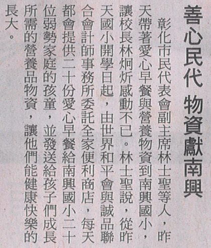 最新消息 news媒體報導 活動訊息 歷史活動 媒體報導 回列表 2011-09-22 【自由時報】善心民代 物資獻南興 【自由時報】善心民代 物資獻南興 自由時報/2011.08.24/記者吳為恭、顏宏駿、湯世名、劉曉欣/彰化報導