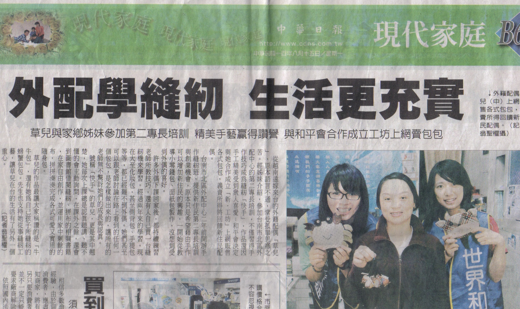 外配學縫紉,生活更充實 中華日報/2011.8.15/記者翁聖權/台南報導 從越南遠嫁來台的外籍配偶「草兒」,原本語言不通,常受孤單思鄉之苦,經姊妹介紹參加台南市北區外配中心的第二專長培訓,不僅習得手作技巧成為縫紉「快手」,作品還因手工精美受到眾人喜愛;和平會決定與她合作成立「新‧工坊」上網販售各式包包,義賣所得回饋新住民配偶。 台南市北區外配中心二年前年開辦手作縫紉班,提供新住民第二專長培訓與創業機會,原本只是希望藉由手作可以增加新住民的興趣,一開始從教導小零錢包、面紙包製作,沒想到受到外偶的喜好。 許多外偶下課回家後,都持續練習老師所教技巧,還有人自己買一台縫紉機來學習。經過兩年來的學習,現在大至化妝包,甚至側背包、手提包等等,都已經難不倒外偶。她們甚至可以跟老師討論在路上看到的任何一個包包,是怎樣做出來的,讓所有的老師無不驚訝她們的成長與認真。 號稱「快手」的草兒,更是其中翹楚,她每次上課總是認真聽講,聽不懂的會主動詢問,在課外之餘,還會到圖書館借閱縫紉、拼布的相關書籍,在家自由創作,並運用家中剩餘的布,拼拼湊湊完成各式可愛又實用的隨身包。 草兒的作品最讓大家稱讚的是牛牛包,還有她為自己孩子所縫紉的螃蟹包包。先生也支持她從事縫紉工藝,讓草兒在台的生活有了另外一個重心。 |