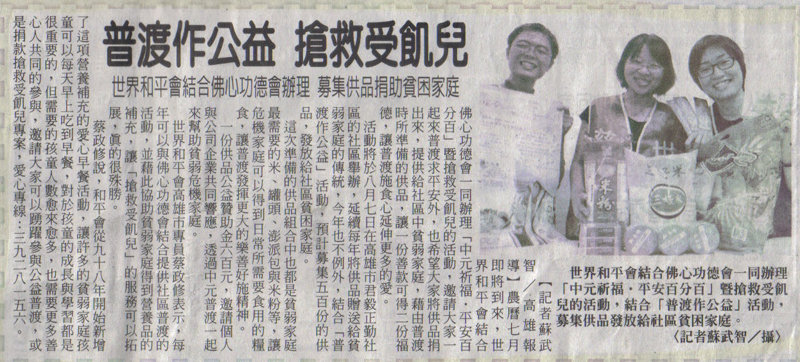普渡做公益 搶救受飢兒 真晨報/2011.7.23/記者蘇武智/高雄報導 農曆七月即將到來,世界和平會結合佛心功德會一同辦理「中元祈福‧平安百分百」暨搶救受飢兒的活動,邀請大家一起來普度求平安外,提供給社區中貧弱家庭,藉由普度時所準備的供品,讓一份善款可得二份福德,讓普度施食心延伸更多的愛。 活動特於八月七日在高雄市君毅正勤社區的社區舉辦,延續每年將供品贈送給貧弱家庭的傳統,今年也不例外,結合「普度作公益」活動,預計募集500份的供品,發放給社區貧困家庭。 此次準備的供品組合中也都是貧弱家庭最需要的米、罐頭、澎派包與米粉等,讓危機家庭可以得到日常所需要食用的糧食,讓普度發揮更大的樂善好施精神。 一份供品公益贊助金六百元,邀請個人與公司企業共同響應,透過中元普度一起來幫助貧弱危機家庭。 世界和平會高雄市公關專員蔡政修表示,每年可以與佛心功德會結合提供社區普度的活動,並藉此協助貧弱家庭得到營養品的補充,讓「搶救受飢兒」的服務可以拓展,真的很殊勝。 蔡政修說,和平會從九十八年開始新增了此項營養補充的愛心早餐活動,讓許多的貧弱家庭孩童可以每天早上吃到早餐,對於孩童的成長與學習都是很重要的,但需要的孩童人數愈來愈多,也需要更多善心人共同的參與,邀請大家可以踴躍參與公益普度,或是捐款搶救受飢兒專案,愛心專線:三九二八一五六。 |