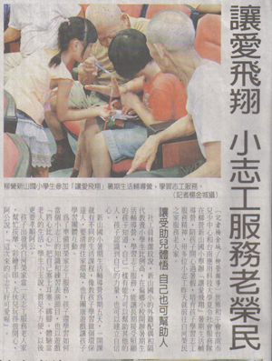 讓愛飛翔 小志工服務老榮民 自由時報/2011.7.8/記者楊金城/台南報導 世界和平會台南市兒少中心和台南應用科技大學夏令社會服務隊在柳營新山國小舉辦「讓愛飛翔」暑期生活輔導營,陪孩子開心過暑假,培育孩子學習志工服務精神,卅多位小志工昨天就前往白河榮民之家服務老人家。 讓受助兒體悟 自己也可幫助人 社工員林霈玟說,新山國小的外籍配偶和隔代教養小學生比例高,在偏鄉小校開辦暑期生活輔導營,學習志工服務,能讓長期接受照顧的孩子知道,自己一樣有能力可以幫助其他的人,孩子認識到自己的力量,也可以建立自信心。 新山國小暑期生活輔導營為期五天,一開課就有不同的生活課程,像教孩子學習做個環保達人,要清理住家環境,也有團康遊戲讓孩子學習團體互動。 為了準備到榮家志工服務,孩子還學習如何當個小志工的知識和練習表演節目,也以遊戲「將心比心」把自己塞上耳塞、綁腳,體驗當老人的生活,學生小玉說,真是不方便,以後更要孝順阿公。 孩子出發到白河榮家當一天志工服務老人家,幫忙按摩、彩繪手印,大伙兒玩得很開心,阿公說,「這次來的小志工好可愛喔」。 |