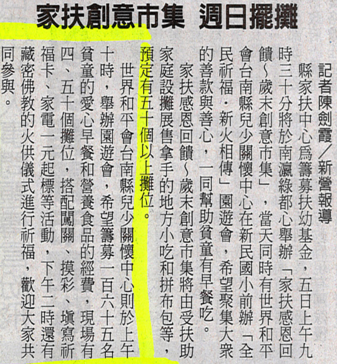 最新消息 news媒體報導 活動訊息 歷史活動 媒體報導 回列表 2011-09-26 【中華日報報導】家扶創意市集 週日擺攤 【中華日報報導】家扶創意市集 週日擺攤 家扶創意市集 週日擺攤 中華日報/2010.12.03/陳劍霞/新營報導 縣家扶中心為籌募扶幼基金,五日上午九時三十分將於南瀛綠都心舉辦「家扶感恩回饋~歲末創意市集」,當天同時有世界和平會台南縣兒少關懷中心在新民國小前辦「全民祈福‧新火相傳」園遊會,希望聚集大眾的善款與善心,一同幫助貧童有早餐吃。 家扶感恩回饋~歲末創意市集將由受扶助家庭設攤展售拿手的地方小吃和拼布包等,預定有五十個以上攤位。 世界和平會台南縣兒少關懷中心則於上午十時,舉辦園遊會,希望籌募一百六十五名貧童的愛心早餐和營養食品的經費,現場有四、五十個攤位,搭配闖關、摸彩、填寫祈福卡、家電一元起標等活動,下午二時還有藏密佛教的火供儀式進行祈福,歡迎大家共同參與。