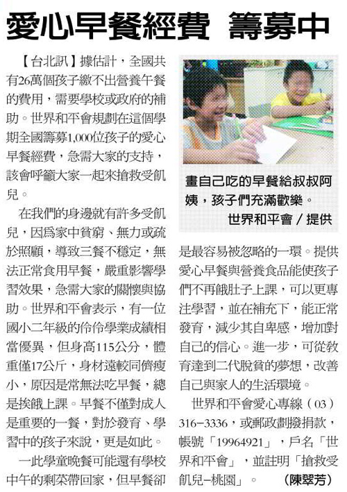 【經濟日報報導】愛心早餐經費 籌募中