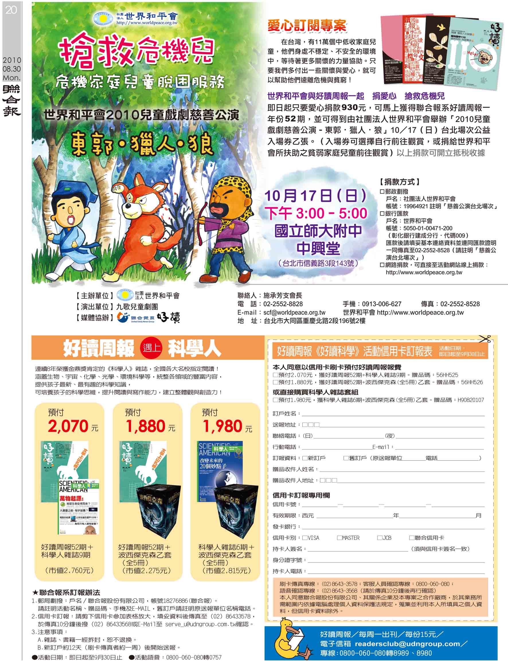 最新消息 news媒體報導 活動訊息 歷史活動 媒體報導 回列表 2011-09-26 【聯合報報導】世界和平會與好讀周報一起 捐愛心 搶救危機兒 【聯合報報導】世界和平會與好讀周報一起 捐愛心 搶救危機兒