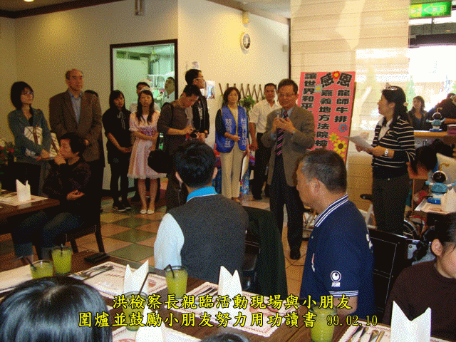 嘉義地檢署結合世界和平會運用緩起訴處分金於99年2月10日中午假龍師牛排,邀請世界和平會嘉義地區100位危機家庭親子,提前圍爐迎新春,和平會受助童代表小文特別親自繪製感恩卡,送給嘉義地檢署洪檢察長光煊,感謝嘉義地檢署關懷和平會兒童的成長。